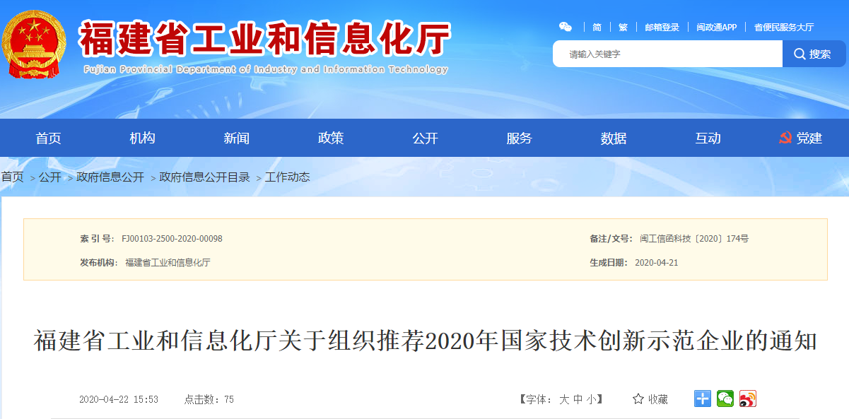 福建省工信廳:關(guān)于組織推薦2020年國(guó)家技術(shù)創(chuàng)新示范企業(yè)的通知