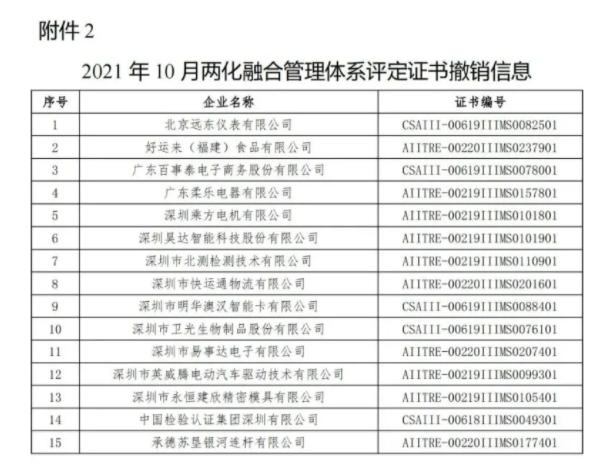 根據GB/T 23003-2018《信息化和工業化融合管理體系評定指南》6.5.3和6.5.4條款規定,中信聯兩化融合管理體系評定工作委員會擬對安徽昌源食品股份有限公司等245 家企業的兩化融合管理體系評定證書予以暫停6個月,北京遠東儀表有限公司等15家企業的兩化融合管理體系評定證書予以撤銷(具體名單詳見附件)。